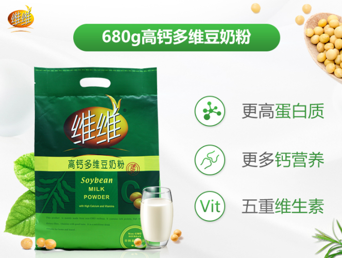 维维高钙多维豆奶粉,增加维生素A、维生素E、维生素B1、B2,更高蛋白质含量,更多钙营养,让每一杯豆奶更多阳光。